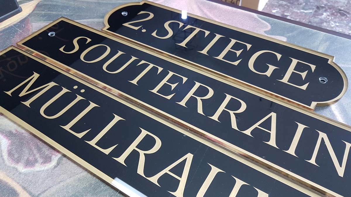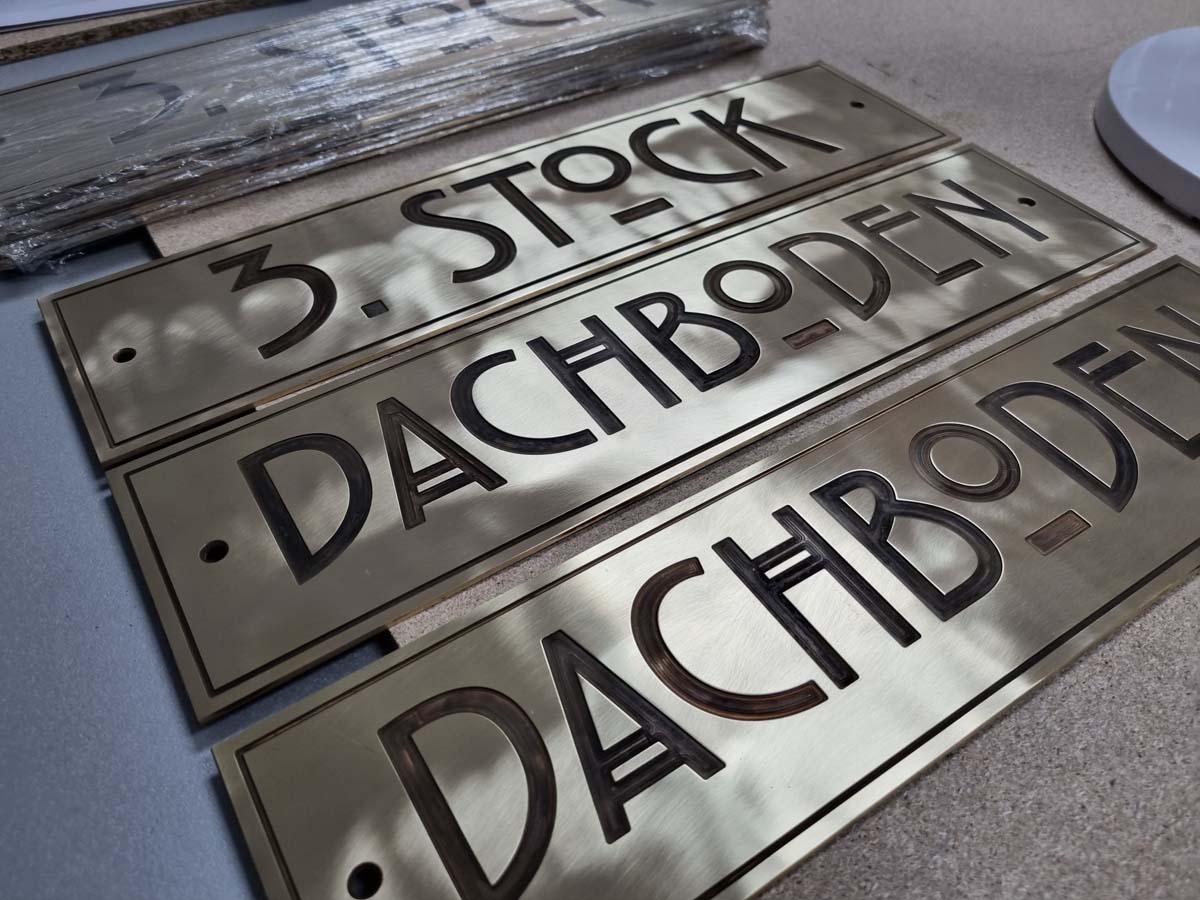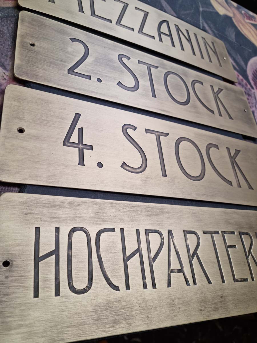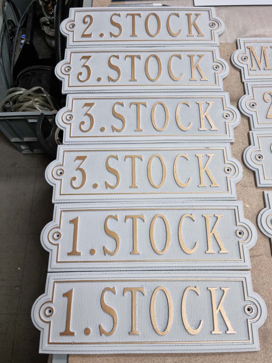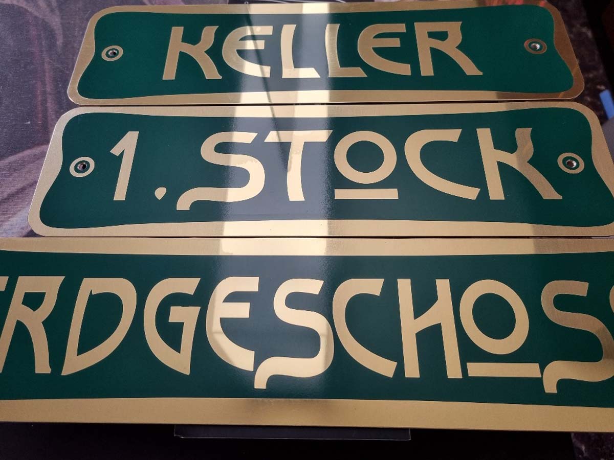Wir fertigen historische Stockwerkbeschilderung, sowie für jede Architektur passende Beschilderung.